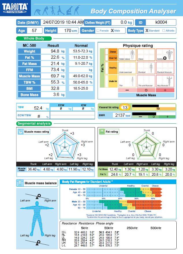 Durch exakte Analyse der Körperzusammensetzung mittels einer modernen Impedanzwaage können wir genaue Aussagen über die Verteilung der Muskelmasse machen. Auch der Körperfettanteil und insbesondere der Bauchfettanteil lässt sich mit Hilfe der Waage ermitteln. Entsprechend gezielt kann dann eine Empfehlung bezüglich der Fettreduktion und der Fettverbrennung erfolgen.
